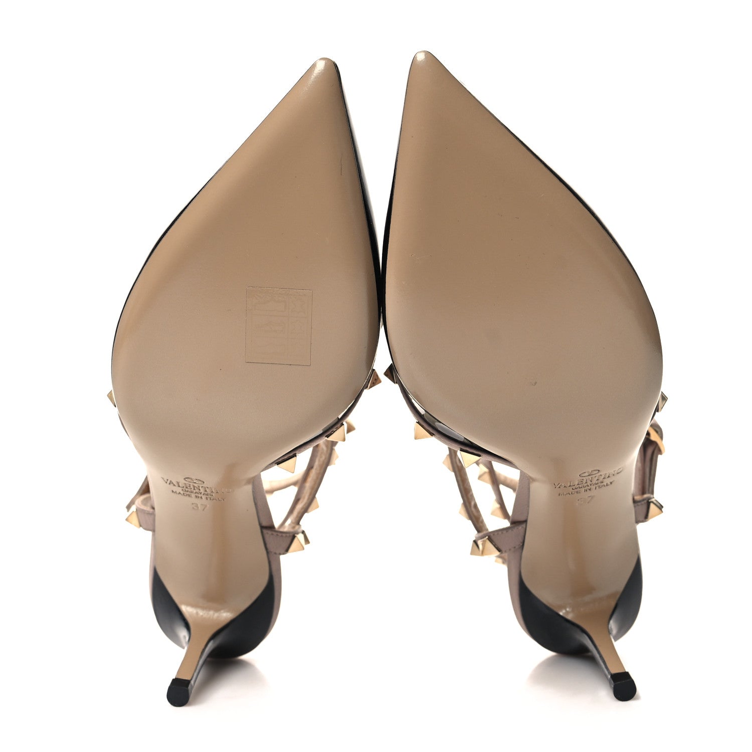 This is an authentic pair of VALENTINO GARAVANI Patent Nappa Rockstud Ankle Strap 65mm Pumps size 37 in Black and Poudre. These stylish pumps are crafted of black patent leather with beige leather trim and ankle straps. They feature a pointed toe, classic gold-toned rockstuds, and a 2.75-inch stiletto heel.Follow this item for alerts. Valentino Garavani is a registered trademark of Valentino Garavani. FASHIONPHILE is not affiliated with Valentino Garavani.