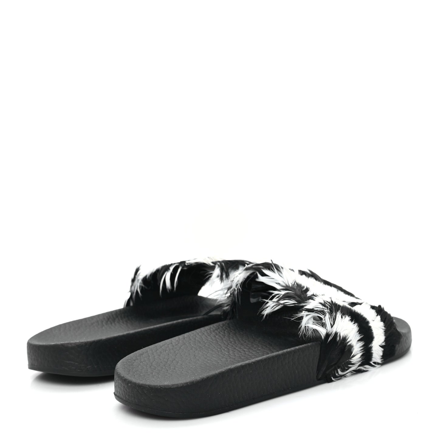 This is an authentic pair of VALENTINO GARAVANI Rubber Feather Pool Slide Sandals size 38 in Black and White. These stunning casual sandals feature a rubber contoured footbed with a toe strap covered in black and white feathers.Follow this item for alerts. Valentino Garavani is a registered trademark of Valentino Garavani. FASHIONPHILE is not affiliated with Valentino Garavani.