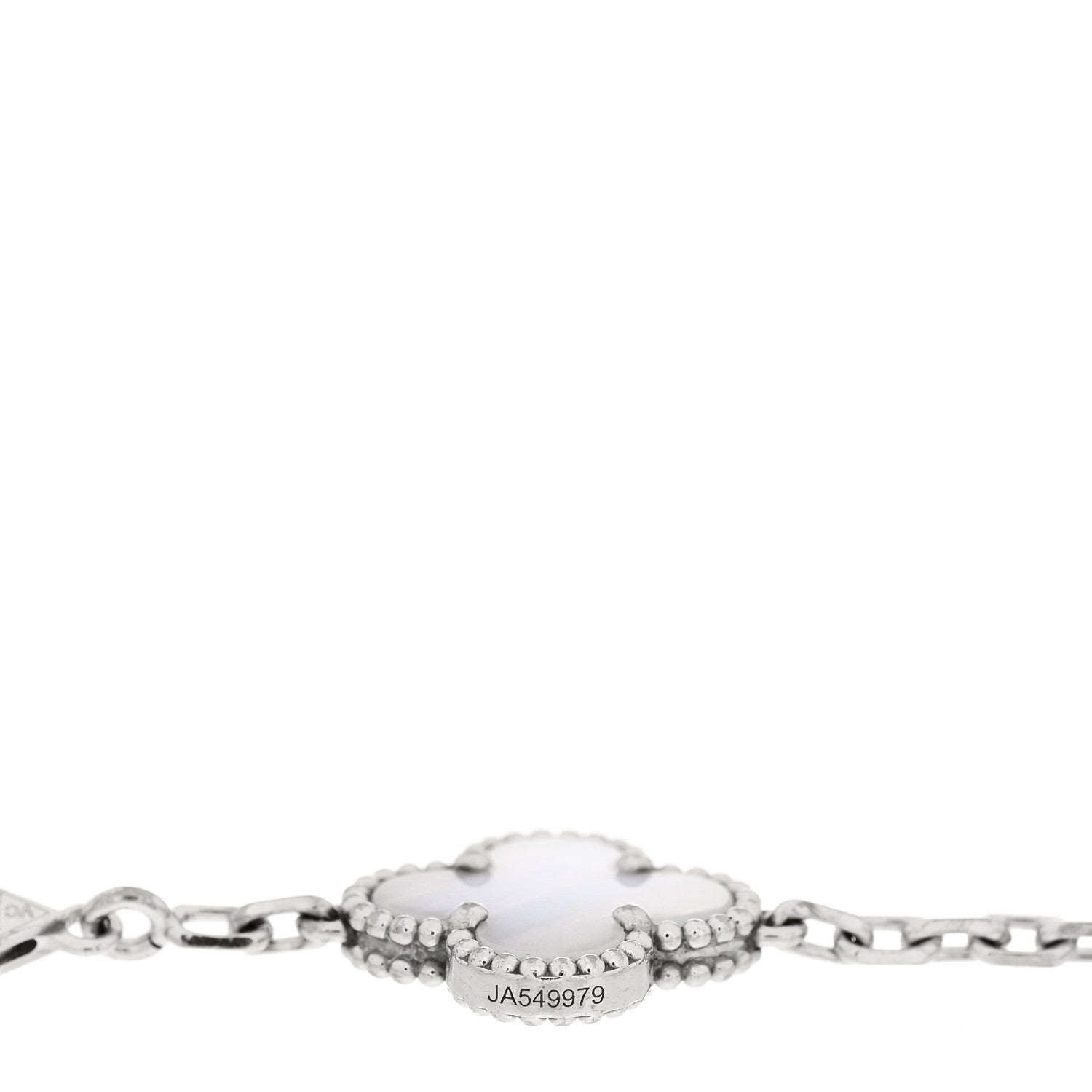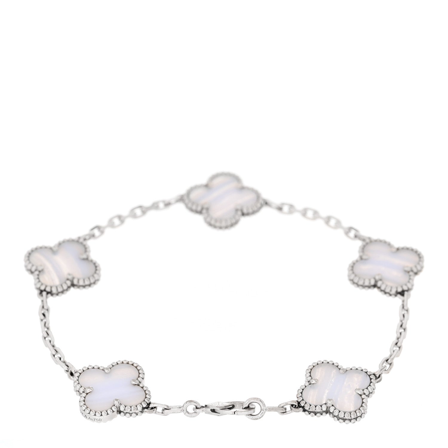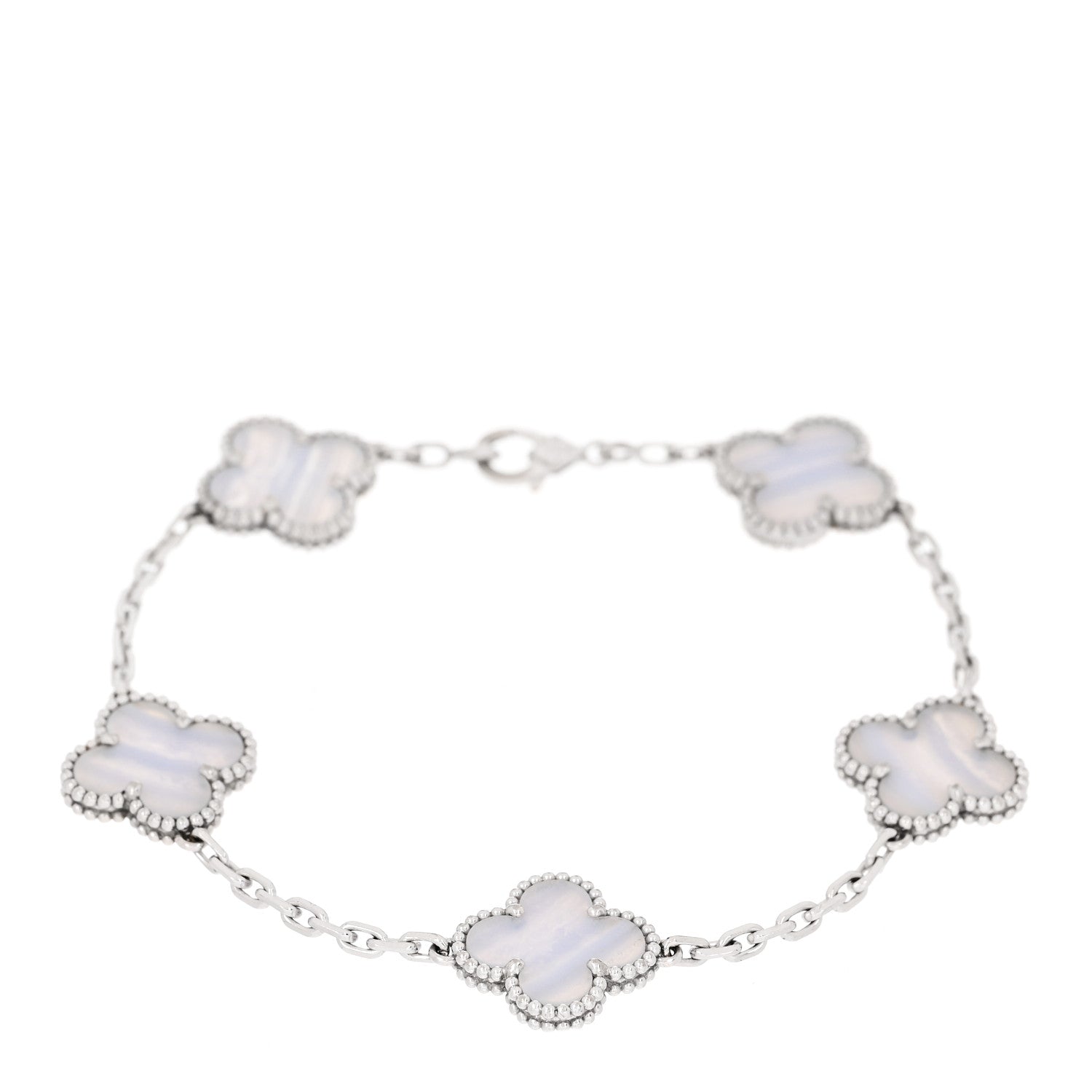 This is an authentic VAN CLEEF & ARPELS 18K White Gold Chalcedony 5 Motifs Vintage Alhambra Bracelet. The bracelet is crafted of 18 karat white gold and features five Alhambra clover motifs set with polished chalcedony and framed by beaded milgrain detail.Follow this item for alerts. Van Cleef & Arpels is a registered trademark of Van Cleef & Arpels. FASHIONPHILE is not affiliated with Van Cleef & Arpels.