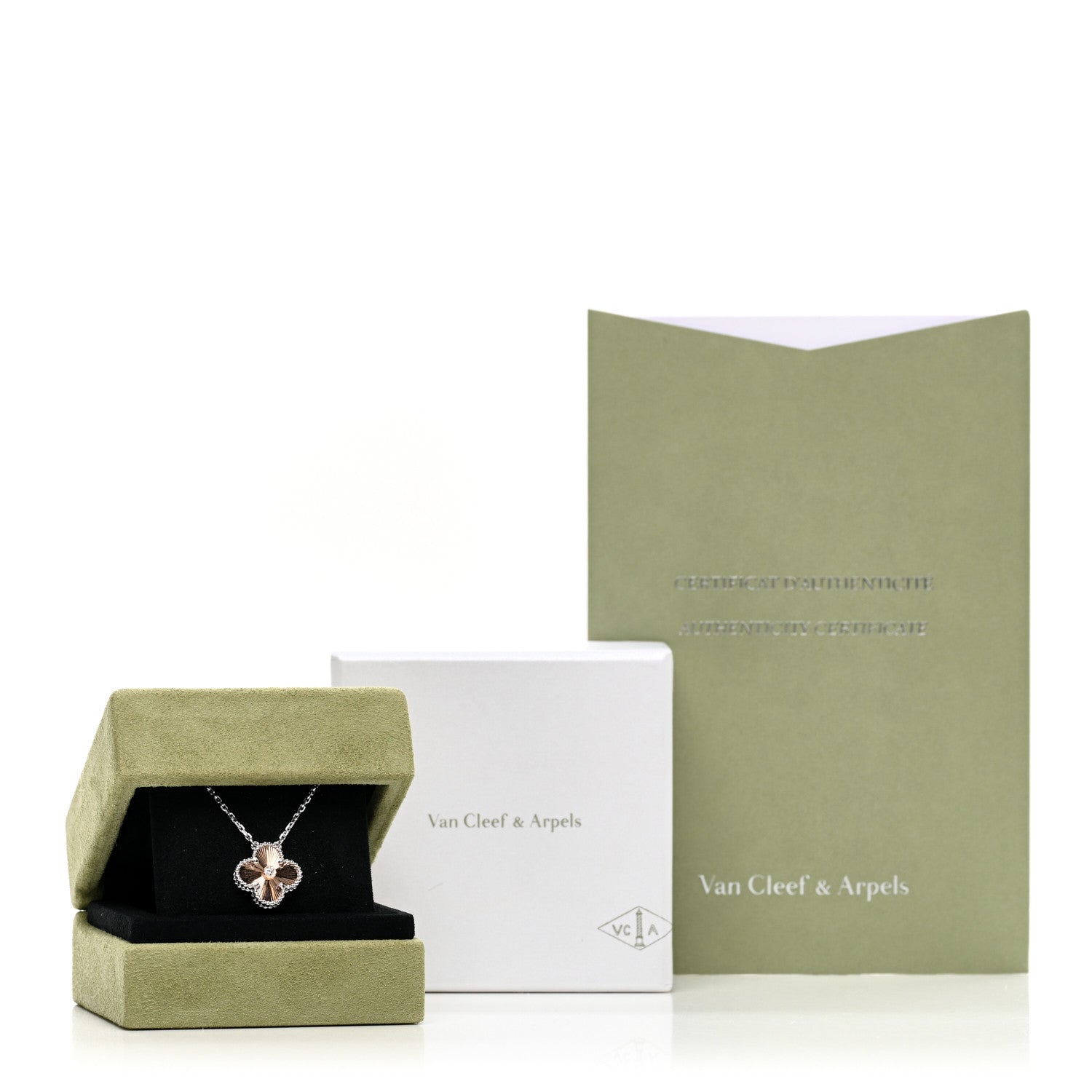 This is an authentic VAN CLEEF & ARPELS 18K White Rose Gold Diamond Guilloche Vintage Alhambra Pendant Necklace. The necklace is crafted of 18 karat white and rose gold and features an Alhambra clover motif with a guilloche design accented with a single round brilliant cut diamond, weighing approximately .05 total carat weight.Follow this item for alerts. Van Cleef & Arpels is a registered trademark of Van Cleef & Arpels. FASHIONPHILE is not affiliated with Van Cleef & Arpels.