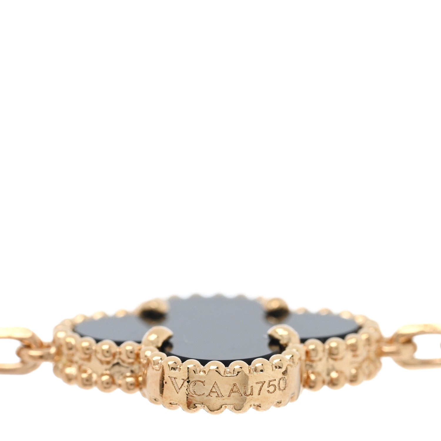 This is an authentic VAN CLEEF & ARPELS 18K Yellow Gold Black Onyx 20 Motifs Vintage Alhambra Necklace. The necklace is crafted of 18 karat yellow gold and features 20 black onyx clover motifs framed by beaded detail. PLEASE NOTE: This piece has a clasp that is no longer in production. Contemporary Alhambra pieces have the Maison Van Cleef and Arpels logo on them. The logo is absent due to age and the iterative jewelry design process and does not affect authenticity.Follow this item for alerts. Van Cleef & Arpels is a registered trademark of Van Cleef & Arpels. FASHIONPHILE is not affiliated with Van Cleef & Arpels.