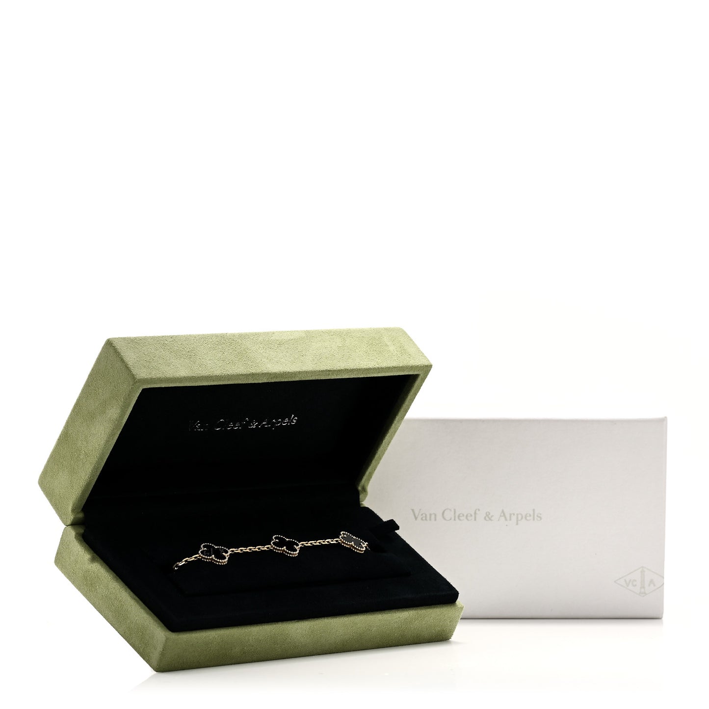 This is an authentic VAN CLEEF & ARPELS 18K Yellow Gold Black Onyx 5 Motifs Vintage Alhambra Bracelet. The bracelet is crafted of 18 karat yellow gold and features five Alhambra clover motifs set with polished black onyx.Follow this item for alerts. Van Cleef & Arpels is a registered trademark of Van Cleef & Arpels. FASHIONPHILE is not affiliated with Van Cleef & Arpels.
