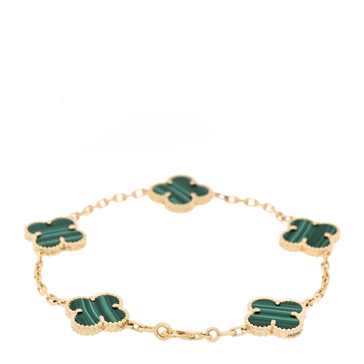 This is an authentic VAN CLEEF & ARPELS 18K Yellow Gold Malachite 5 Motifs Vintage Alhambra Bracelet. The bracelet is crafted of 18 karat yellow gold and features five clover motif stations set with malachites. PLEASE NOTE: One malachite motif has been replaced at Van Cleef & Arpels.Follow this item for alerts. Van Cleef & Arpels is a registered trademark of Van Cleef & Arpels. FASHIONPHILE is not affiliated with Van Cleef & Arpels.