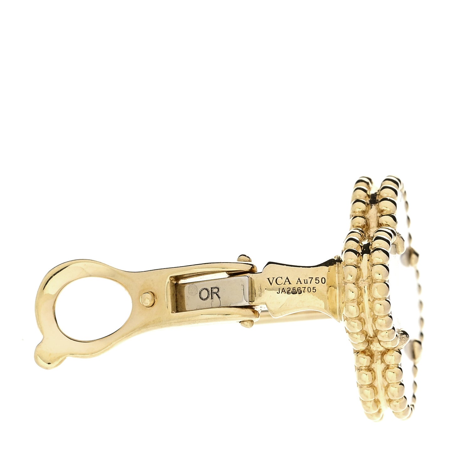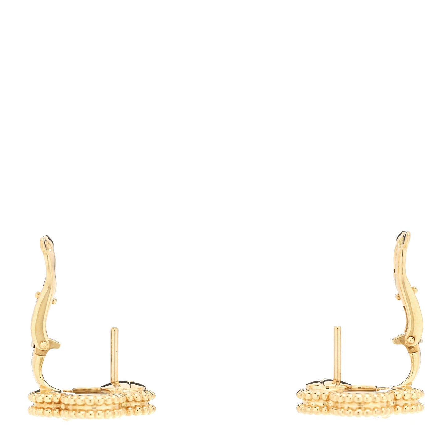 This is an authentic pair of VAN CLEEF & ARPELS 18K Yellow Gold Mother of Pearl Vintage Alhambra Earrings. The earrings are crafted of 18 karat yellow gold and feature an Alhambra clover motif set with mother of pearl framed by beaded detail.Follow this item for alerts. Van Cleef & Arpels is a registered trademark of Van Cleef & Arpels. FASHIONPHILE is not affiliated with Van Cleef & Arpels.