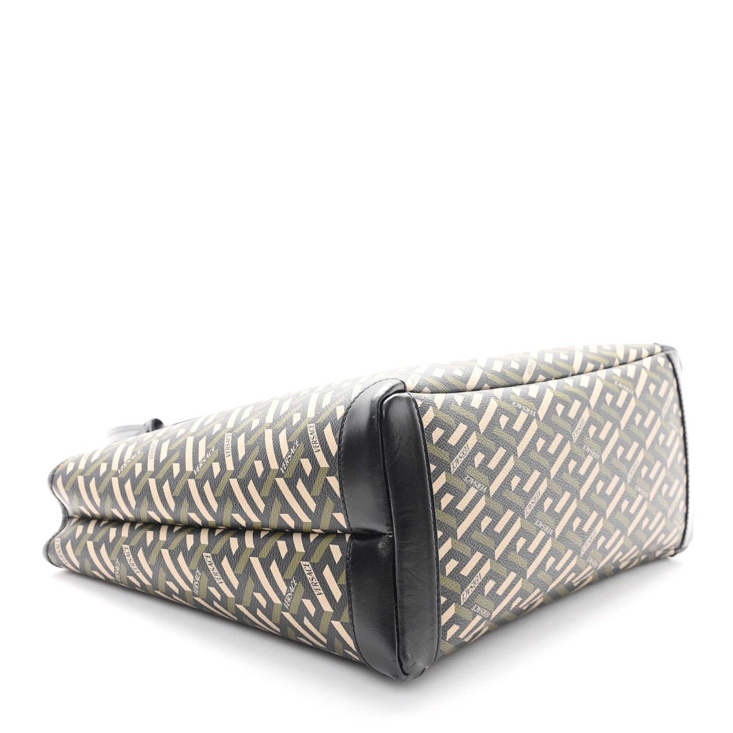 This is an authentic VERSACE Canvas Calfskin Monogram La Greca Medusa Tote in Black and Khaki. This luxurious bag is crafted of coated cavas in black, green and beige. The tote features black leather strap handles and black leather trim. The top opens to a black fabric interior with a removable pouch.Follow this item for alerts. Versace is a registered trademark of Versace. FASHIONPHILE is not affiliated with Versace.