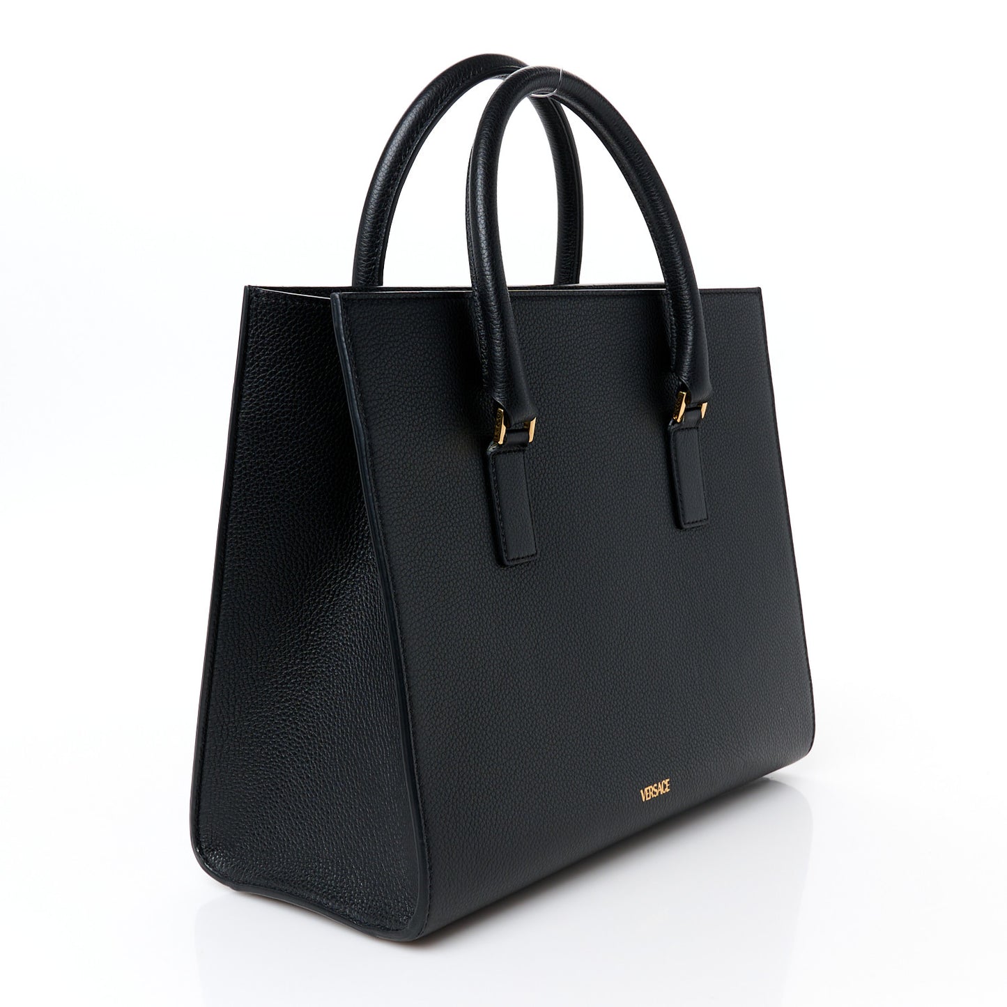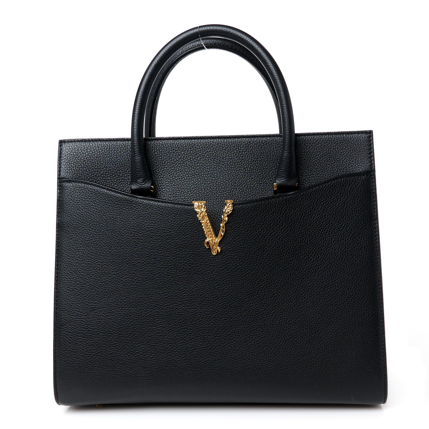 This is an authentic VERSACE Grained Calfskin Large Virtus Top Handle Shoulder Bag in Black. This chic shoulder bag is crafted of grained calfskin leather in black. The bag features leather top handles and a polished rose gold V. The top opens to a black fabric interior with a patch pockets.Follow this item for alerts. Versace is a registered trademark of Versace. FASHIONPHILE is not affiliated with Versace.
