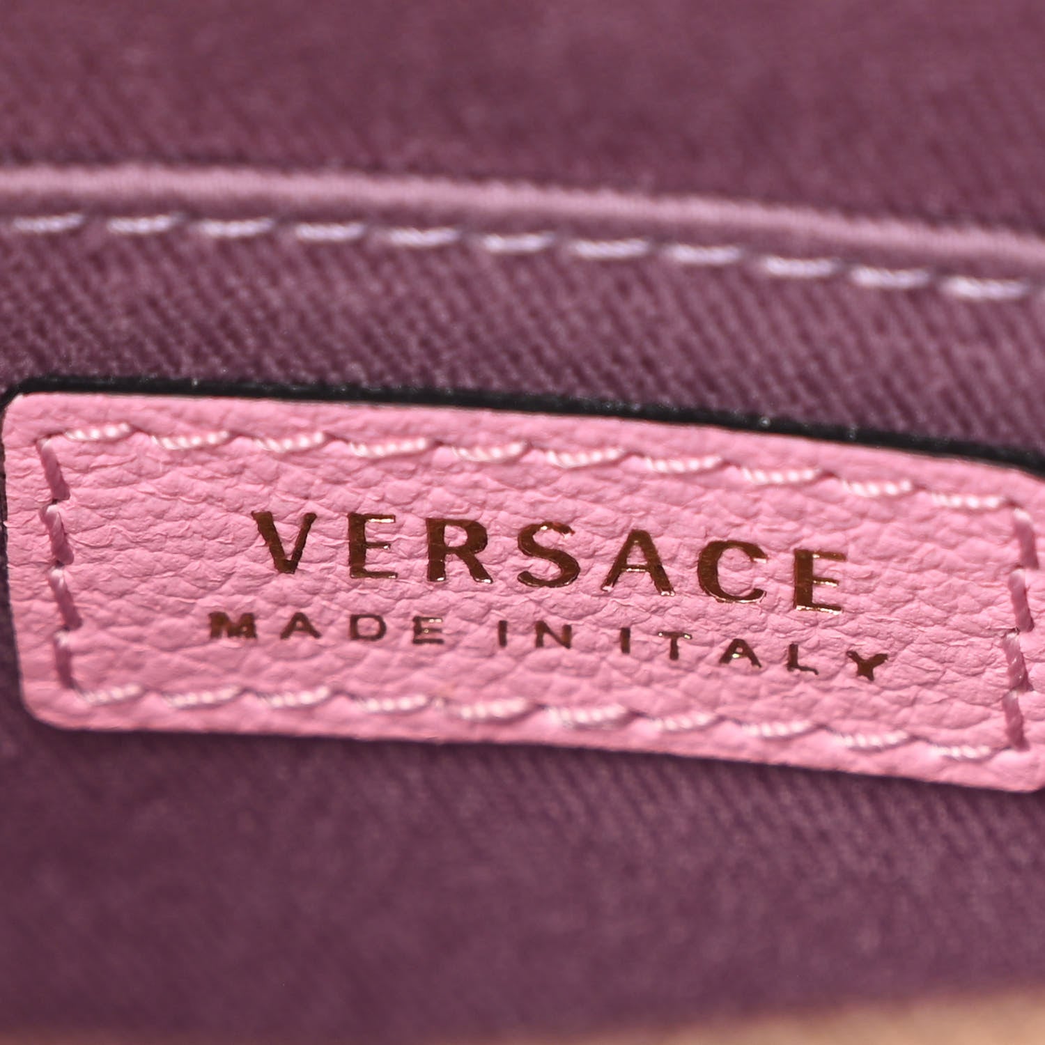 This is an authentic VERSACE Grained Calfskin Studded Mini La Medusa Round Crossbody Bag in Pink. This handbag is crafted of pink leather. This bag features a front facing medusa figure, polished gold hardware, and a crossbody strap. The top zipper opens to a fabric interior.Follow this item for alerts. Versace is a registered trademark of Versace. FASHIONPHILE is not affiliated with Versace.