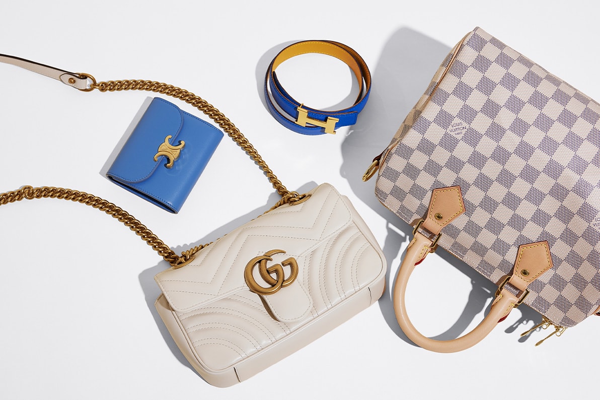 • one beige Chanel top handle rectangular flap bag, one grey Louis Vuitton Giant Mongram Onthego Tote bag, and one Rolex watch sitting in it's green Rolex case